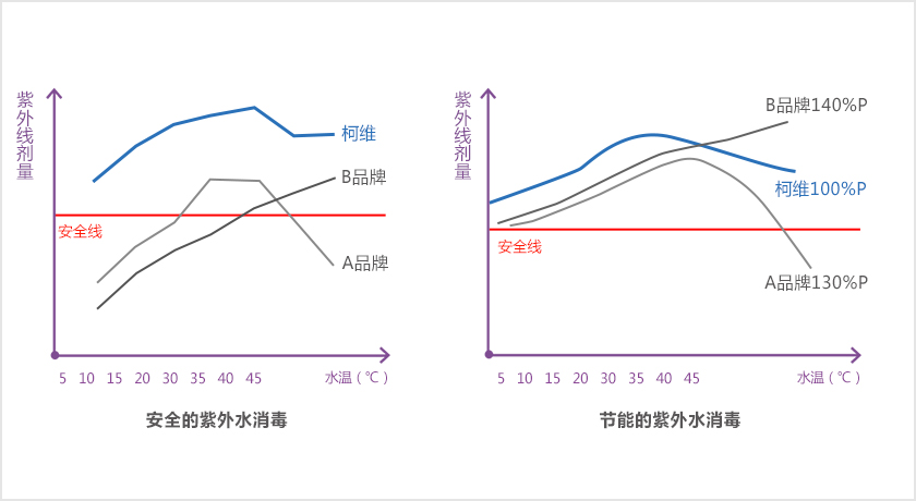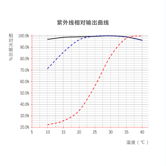 When the working water temperature changes from 5-40 degrees Celsius (season, day and night temperature difference), the UV output is stable and meets the disinfection UV dose requirements.
